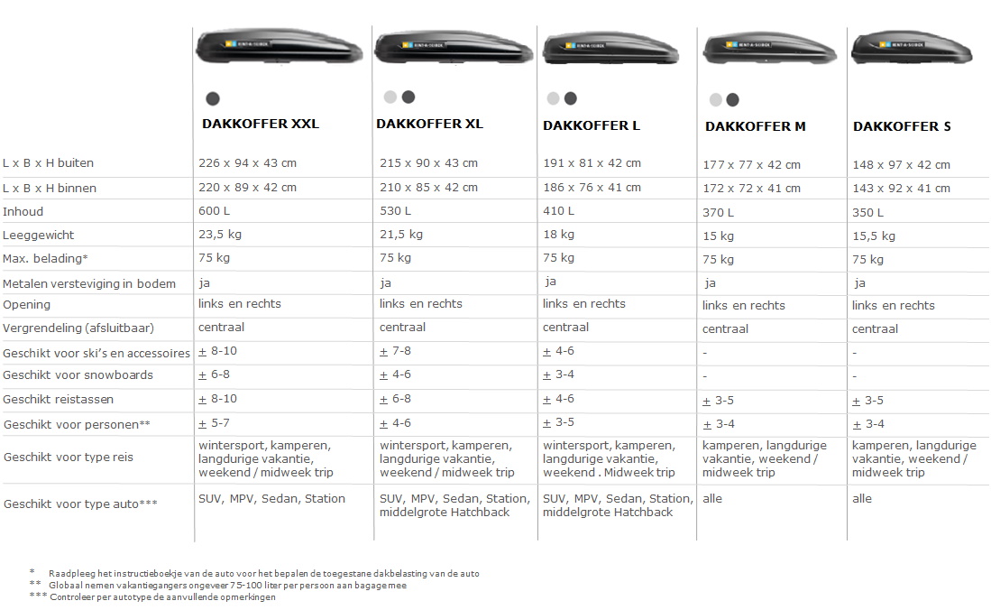 In de zomervakantie zijn de meest gehuurde modellen Dakkoffer M en Dakkoffer L . Die passen op vrijwel iedere auto en bieden bagageruimte voor 5 grote reistassen. Voor wintersport worden Dakkoffer L en Dakkoffer XL het meest gehuurd. Voor langere voorwerpen zoals vishengels en langlaufski's zijn de Dakkoffer XL en de Dakkoffer XXL passend.